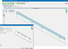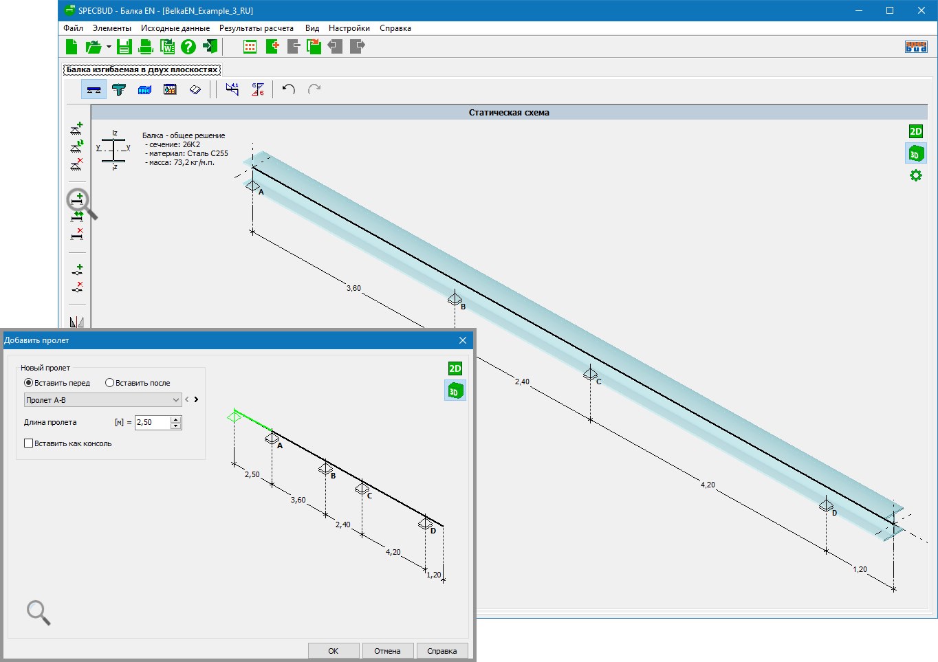 Схема балки задается путем указания числа и размера пролетов и консолей, а также условий опирания и положением шарниров в пролетах. При расчетах возможна быстрая корректировка схемы балки без изменения заданных нагрузок. Балка может быть отображена в плоском виде (2D) или изометрическом (3D).
