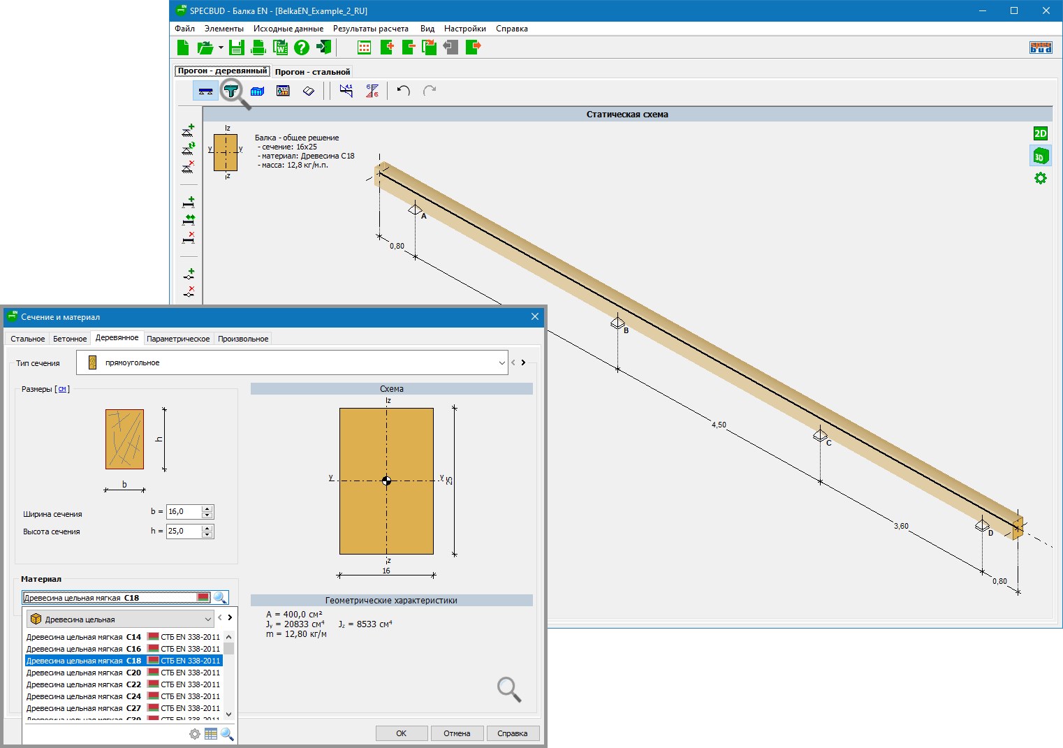 Задание сечения и материала балки облегчают встроенные библиотеки стальных профилей (с возможностью добавления Пользователем собственных сечений), бетонных и деревянных сечений, а также калькулятор геометрических характеристик сечений различных форм.