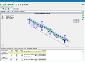 Результаты статических расчетов отображаются в 2D или 3D виде, для отдельных случаев нагружений, сочетаний и огибающих, в виде эпюр изгибающих моментов, поперечных усилий, а также линии прогибов балки. Данные величины также приведены в табличной форме, для характерных сечений балки и других сечений, указанных проектировщиком.