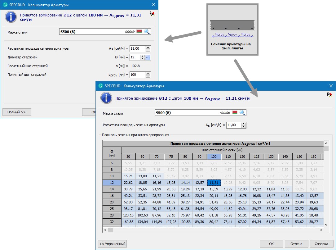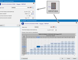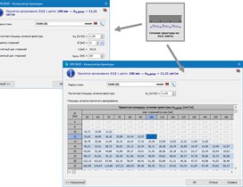 - полном, в котором выбор площади сечения осуществляется в таблице, представляющей площади сечения для различных пар диаметр/число стержней (шаг стержней)