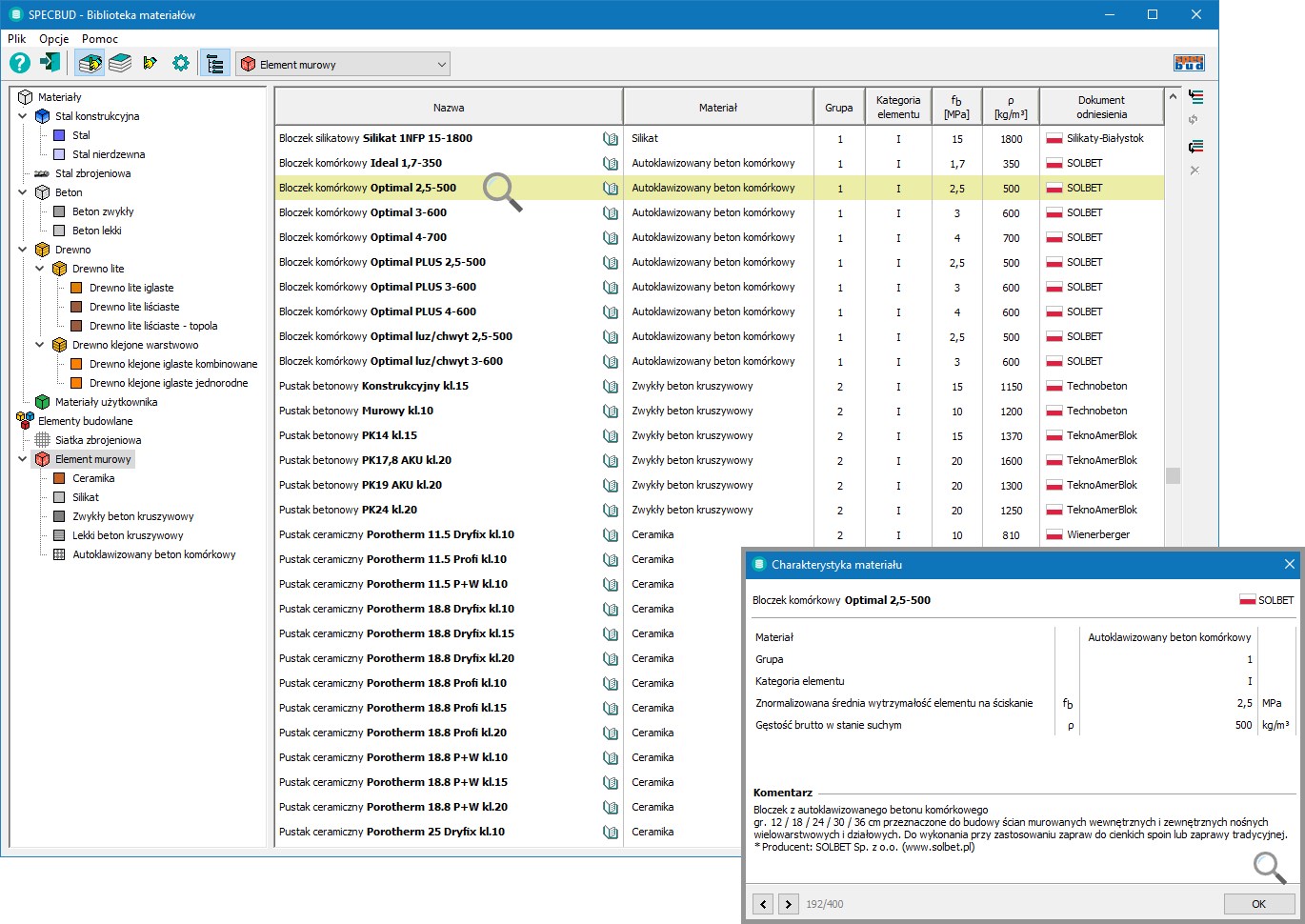 - имеется встроенный список типовых кладочных изделий, с возможностью пополнения его Пользователем дополнительными изделиями, на основании собственной информации об их свойствах;