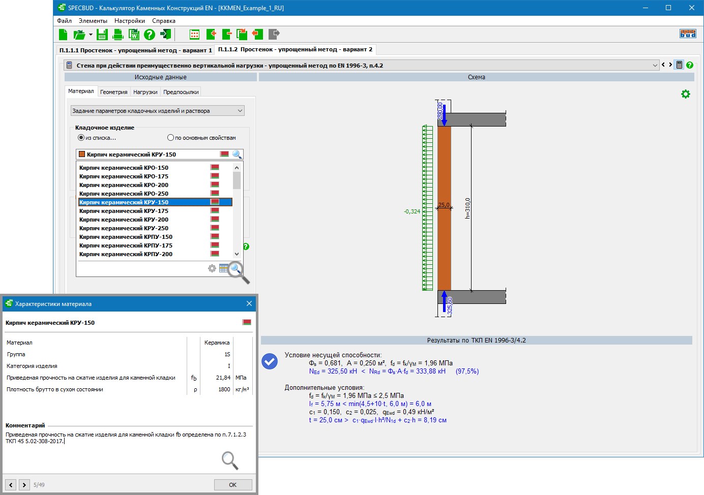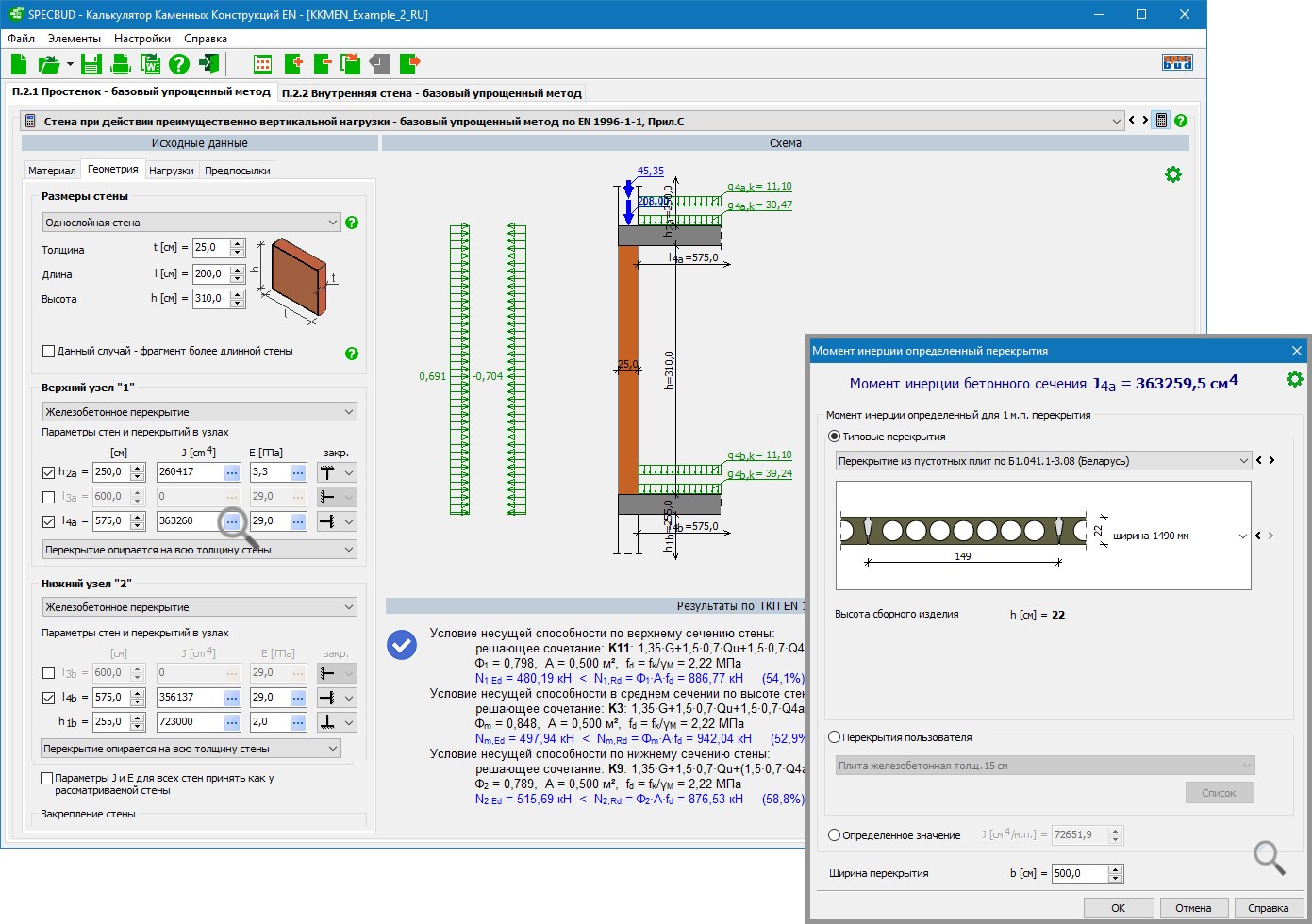Программа является калькулятором каменных неармированных конструкций, выполняющим расчеты в рамках основных проектных положений норм EN 1996-1-1, EN 1996-3 и EN 1996-1-2.