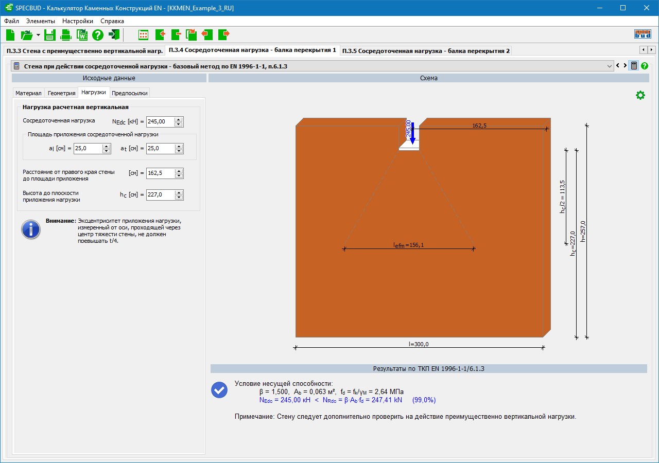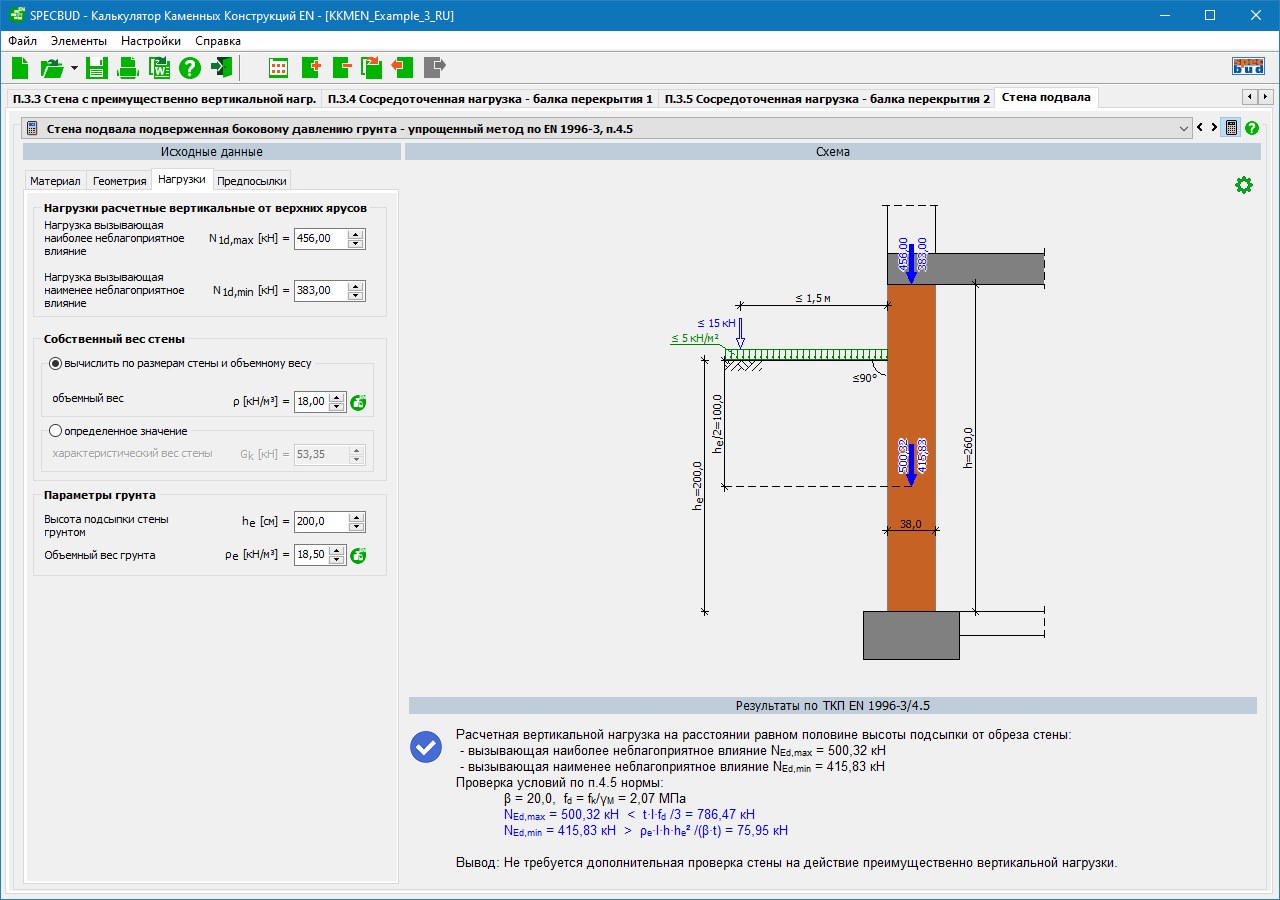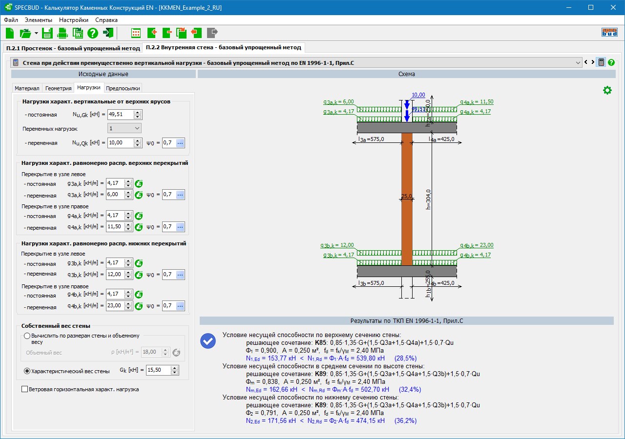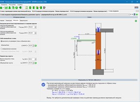 - условия несущей способности проверяются в характерных местах стен, с представлением промежуточных результатов (как например, геометрические характеристики, коэффициенты и значения прочностей, внутренние усилия и т.д.);