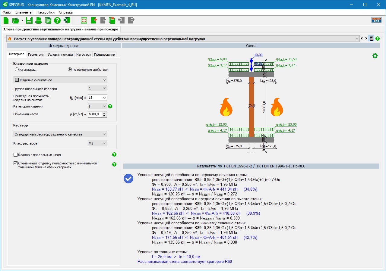 , т.е. основная версия программы (без расширяющих модулей), учитывает положения содержащиеся в Еврокодах EN 1996-1-1 и EN 1996-3 с беларускими Национальными Приложениями и является калькулятором каменных неармированных конструкций. - Модуль расширяющий Калькулятор Каменных Конструкций EN – Анализ при пожаре