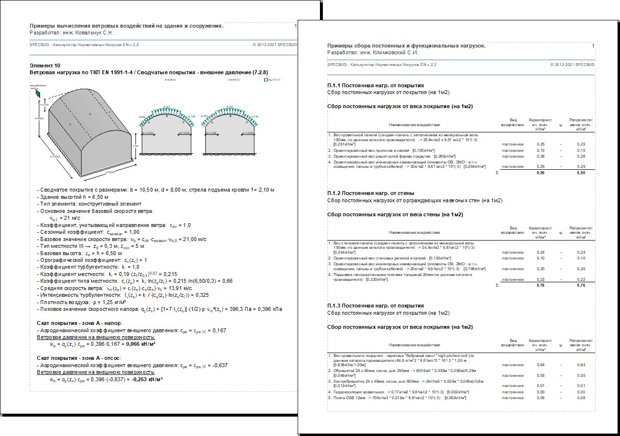 Программа рассчитывает характеристические значения постоянных и функциональных нагрузок, а также детально представляет процедуры расчетов значений снеговой нагрузки, ветрового или температурного воздействий для выбранного проектного случая, совместно со схемой этого расчетного задания. Пользователь дополнительно может создавать и каталогизировать свои собственные базы нагрузок. Программа предоставляет возможность собирать нагрузки в форме таблиц сбора нагрузок (поверхностных, линейных или сосредоточенных). Созданные таблицы сбора нагрузок и детальные расчеты можно распечатать или вставить в текстовый редактор.