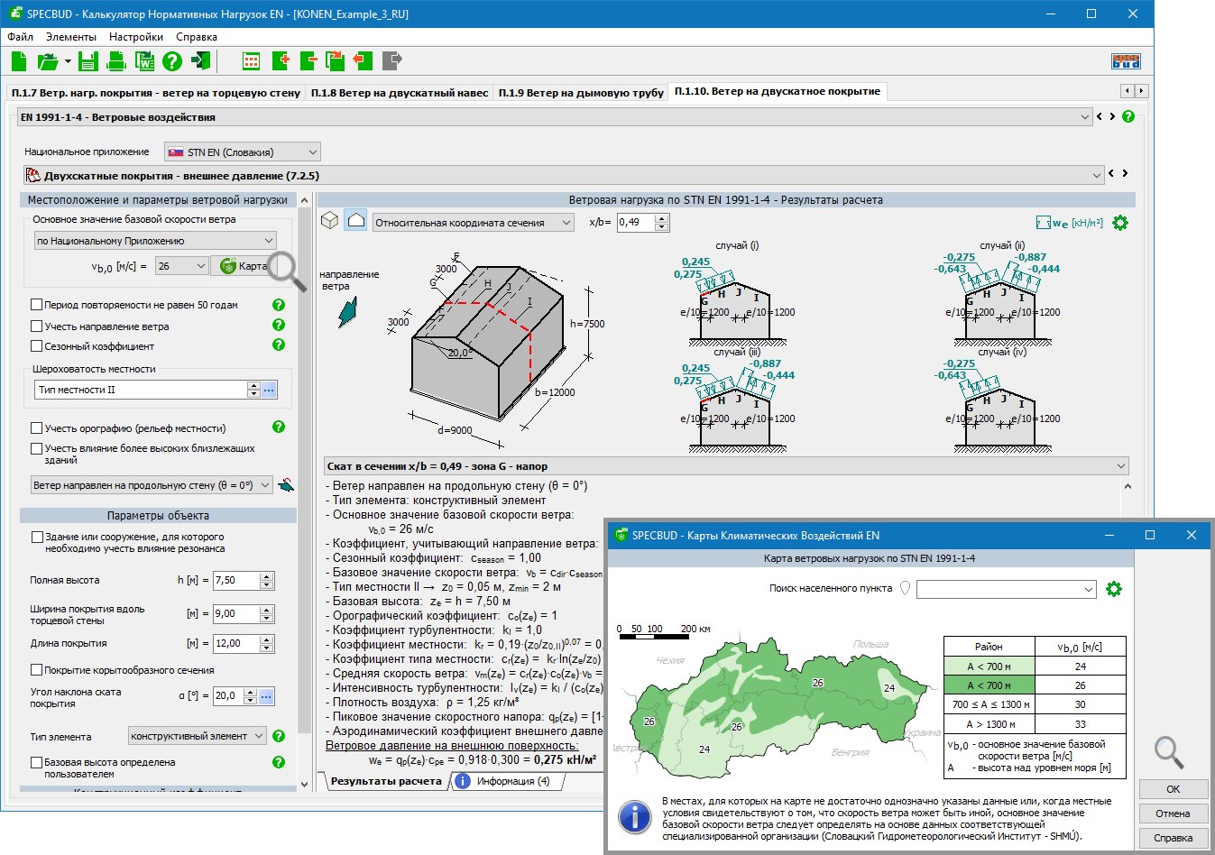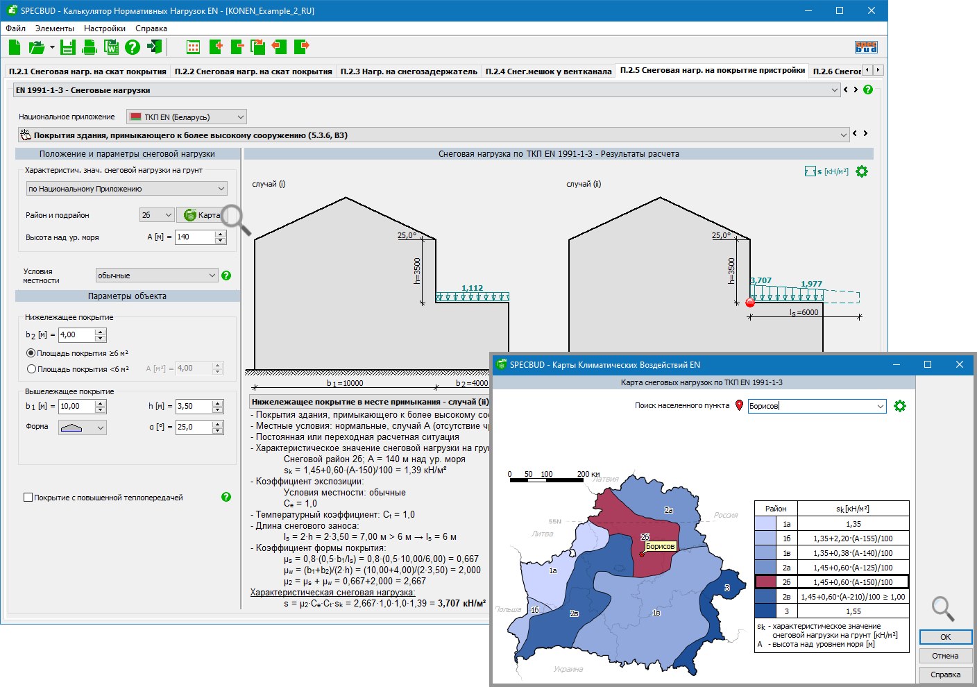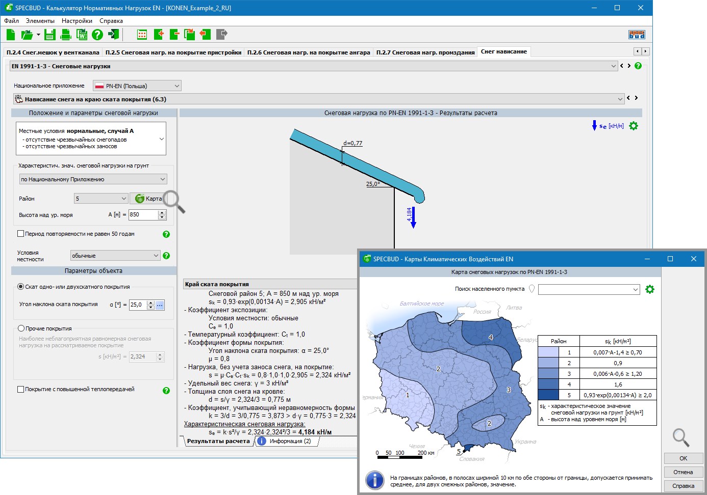 - встроенные подробные карты районов климатических воздействий – снеговых, ветровых, температурных;