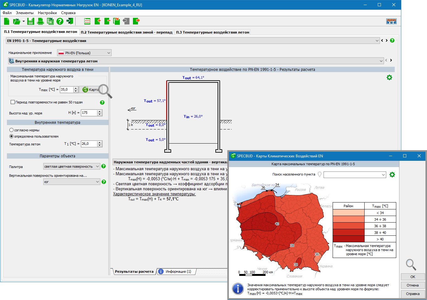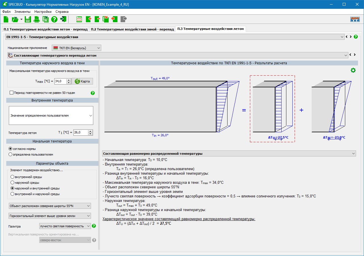 | ► Температурные воздействия – определение температурных воздействий на здания и другие конструкции и их элементы (внутренняя и наружная температура летом и зимой, а также составляющие температурного перепада) в соответствии со стандартом EN 1991-1-5. |